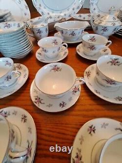 With a beautiful pink floral pattern.... This is a 7 piece place setting for 12 minus 1 saucer...